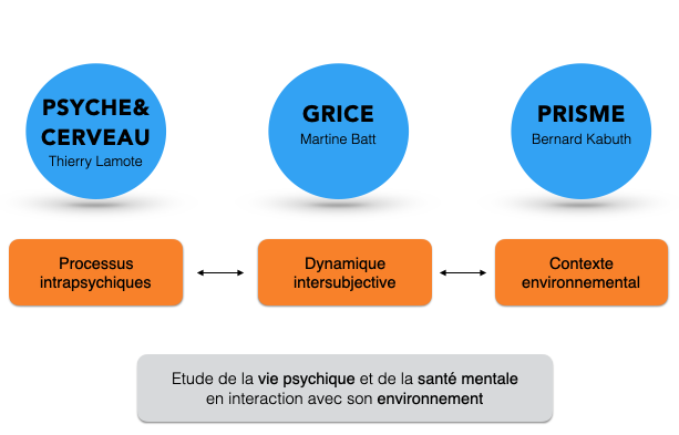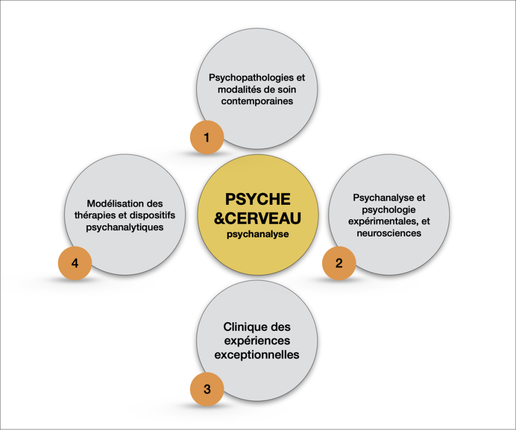 L’équipe Psyché & Cerveau développe des travaux dans le champ de la psychologie, de la psychologie clinique et de la psychopathologie selon une approche orientée essentiellement par la psychanalyse. Elle se réfère également à des approches plus quantitatives et expérimentales en vue d’opérationnaliser diverses observations provenant du pratique clinique ainsi que certaines hypothèses psychanalytiques et neuropsychologiques. Les travaux de cette équipe concernent plus particulièrement 1) les psychopathologies et modalités de soin contemporaines et leurs enjeux sociétaux, 2) la psychanalyse et psychologie expérimentales, et neurosciences 3) la clinique des expériences exceptionnelles et 4) l’évaluation et modélisation des psychothérapies et dispositifs psychanalytiques.